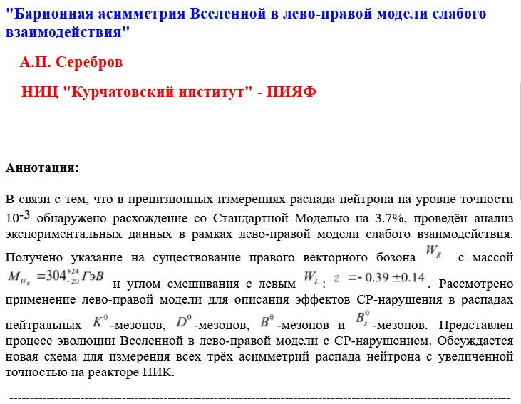 .В связи с тем, что в прецизионных измерениях распада нейтрона на уровне точности 10-3 обнаружено расхождение со Стандартной Моделью на 3.7 sigma, проведён анализ экспериментальных данных в рамках лево-правой модели слабого взаимодействия. Получено указание на существование правого векторного бозона WR c массой MWR = 304 (+24 -20) GeV и углом смешивания с левым yWrwZWroGbQPTSsd.png: qwr1TdgnlRxp22D1.png. Рассмотрено применение лево-правой модели для описания эффектов СР-нарушения в распадах нейтральных 7n3xlHStmbolAzN7.png-мезонов, figqK1c1y7609FgS.png-мезонов, VFG28J9ZLeZkCpR3.png-мезонов и V8Hz91HN3Gr80S0P.png-мезонов. Представлен процесс эволюции Вселенной в лево-правой модели с СР-нарушением. Обсуждается новая схема для измерения всех трёх асимметрий распада нейтрона с увеличенной точностью на реакторе ПИК.